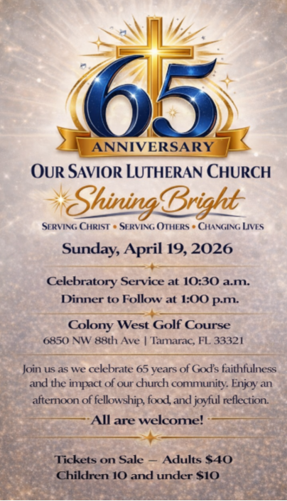 You are invited to Our Savior’s Luther Hall, Wednesdays at 10a.m. for Discussion Group beginning April 8th. Each week we will gather together to explore the meaning of current topics from a biblical perspective. Refreshments are served. Please telephone the church office at 954-473-6888 or email Pastor at tdurante@oursaviorplantation.org for more information.